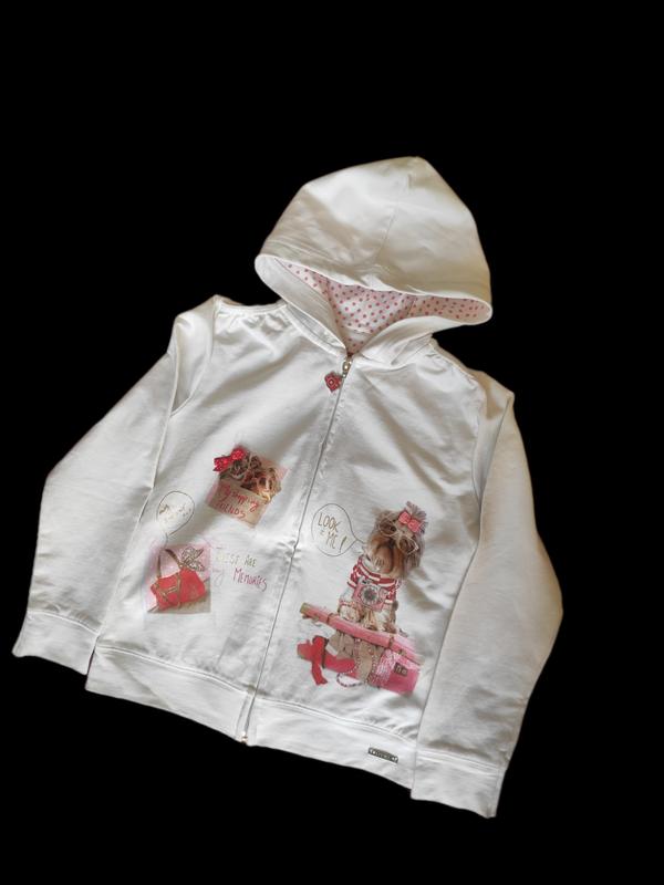 Эта вещь станет самой любимой для вашей девочки, а белый цвет придаст изысканности ее образу. Худи украшена качественным принтом. Капюшон с внутренней стороны в веселый розовый горох. Ткань очень приятная на ощупь и содержит 95% хлопка и 5% эластана.