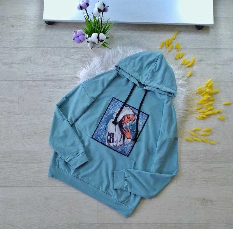 Красивое худи с пришивной аппликацией😍😍😍😍😍 Нежный цвет, подойдет под любой образ 🤗🤗🤗. На капюшоне есть канатики и один большой карман впереди Тканина : двонитка💥 Производитель: Украина🇺🇦 р.164-1шт ЗАМІРИ ⤵ +/- 1-2см!!! р.164-длина 64 см /ПОГ 50 см/рукав от горловины 71 см