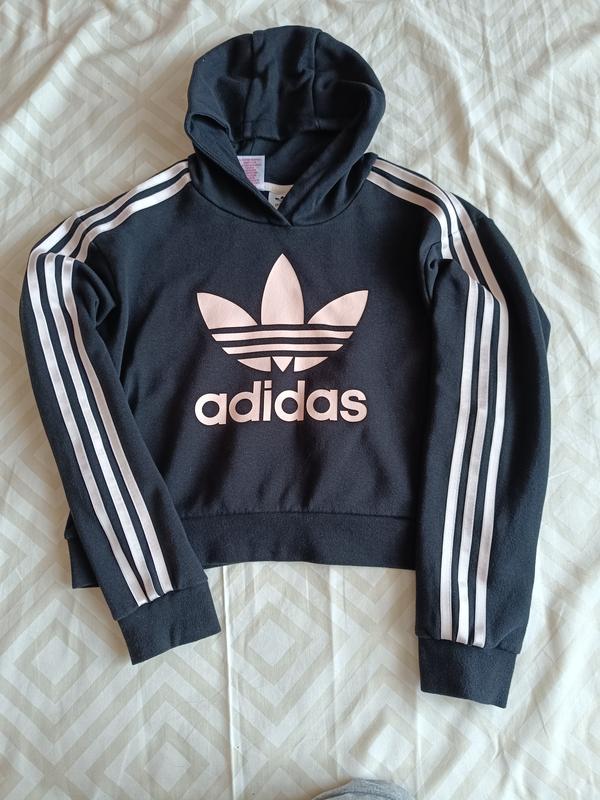 укороченное худи Adidas в идеале. насыщенного черного цвета, на фото загорает 11-12 лет рост 152. Оригинальн! внутри как будто. рукав 52 см, от капюшона 66.5 см длина 47 см, ширина под руками 50 см