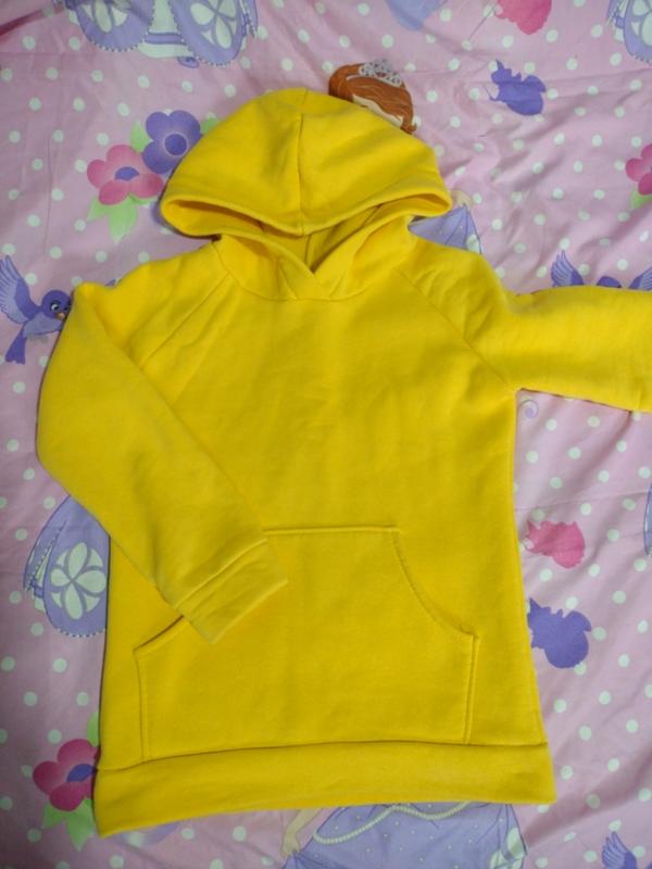 Кофта, худи детская.ярко желтого цвета, 100% хлопковая ткань, достаточно толстая, внутри красивый начес.Очень тепла! Имеет удобный карман кенгуру и капюшон Замеры на фото При покупке двух товаров оплатой на карту третий самый дешевый в подарок!!!!