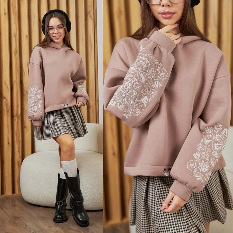 Таня Арт 5871 Худи с очаровательной этно-вышивкой на рукавах с капюшоном и утяжкой по низу Ткань-турецкая трехнить на флисе очень приятная на ощупь СУПЕР КАЧЕСТВО! рост/длина/пог/рукав от горловины похибка+-2см 140-146/46/53/57-1шт 146-152/49/55/60-1шт 158-164/55/58/67-1шт