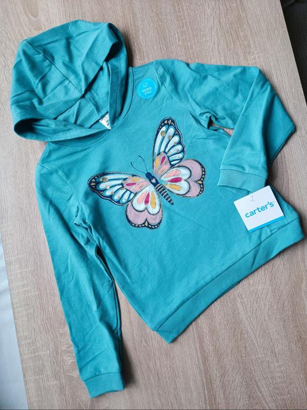 Толстовка для девочки бирюзовая из 100% хлопка с капюшоном. Трикотажные манжеты на рукавах и по низу изделия тянутся, но не растягиваются. Декоративный элемент - термопринт бабочка