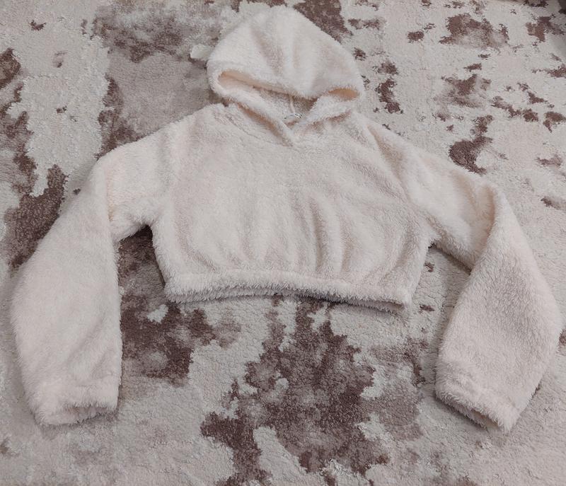 Укороченый плюшевый худи с капюшоном на девочку 11-12 лет. Замеры представлены на фото.