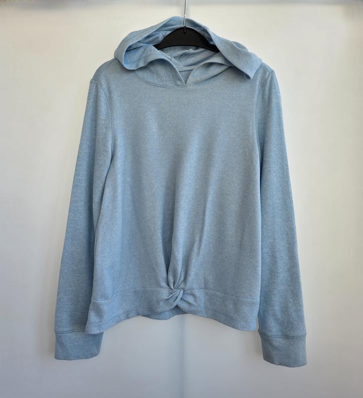 Красивый мягенький реглан с капюшоном. Отлично для прогулок и для занятий спортом. Ткань очень эластичная, мягенькая, отлично тянется. Цвет нежно-голубой. Размер 134-146. Длина 49 см полуобхват груди 39 см рукав от плеча 52 см