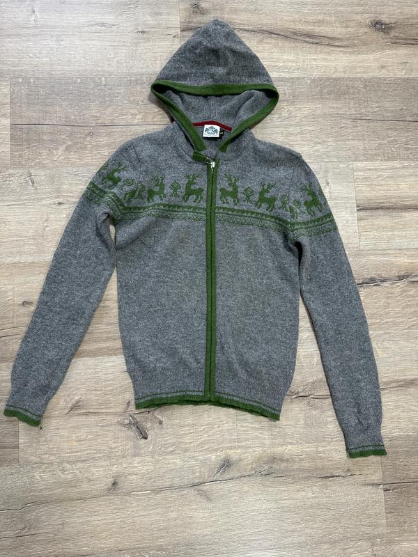 Кофта типа худи с капюшоном, из шерсти ламы Имеет рисунок олени Застежка молния Состояние новой пОг 43 Длина 59 Рукав 67 см Рост 164 см Производитель Германия бренд hammerschmid