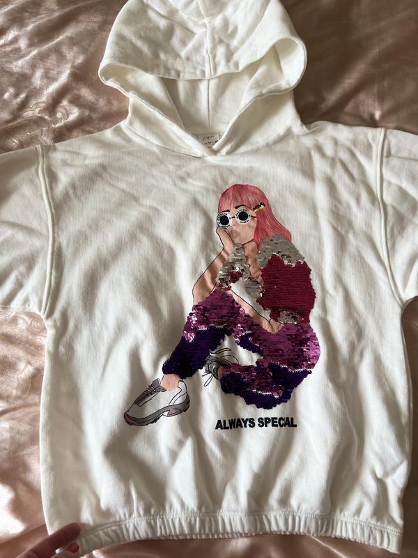 Худі Zara - нова. На зріст -152 см ( 11-12 років). Модель знизу на резинці та на рукавах . Біла з яскравим малюнком в паєтках. Не тепла ( двонитка). Скалад - 100% бавовна Заміри в фото вислала