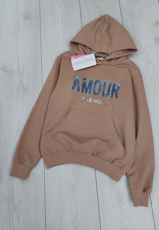 Стильное худи для девушки в темно бежевом цвете с джинсовой надписью от турецкой фирмы "Pampella". Стильно смотрится в сочетании с джинсами. Склад:95%- котон;5%- еластан. Размеры в наличии: 9-10р/134-140см: плечи-40см. рукав от плеча-52см. длина-50см. ПОГ-42см. 11р/146см: плечи-42см. рукав от плеча-53см. длина-53см. ПОГ-43см. 12р/152см: плечи-43 см. рукав от плеча-55см. длина-55см. ПОГ-45см. 14-15р/170-176см: плечи-47см. рукав от плеча-60см. длина-59см. ПОГ-48см.