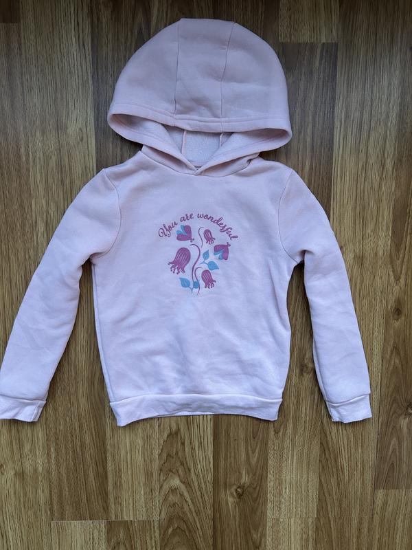 Худі ніжно- рожевого кольору, утеплена флісом, по бірці 128, але як на мене маломірить, заміри:довжина -47 см,рукав-45 см , пог-36 см.