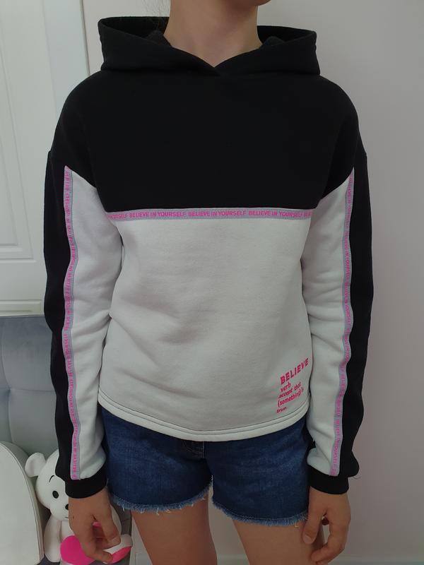 В продаже красивое худи из более новых коллекций Модель укорочена Внутри чуточку утепленная Красивое сочетание цветов Размер 11 - 12 лет Рукав немножко в этой модели приопущен, поэтому замеры его от шеи и его длина 66 см Длина кофты по спине 45 см Состояние отличное (не ношене 👌) Цена 180 грн🏷 Не маломерит Красиво сочетается как джинсами так и с спортивными брюками