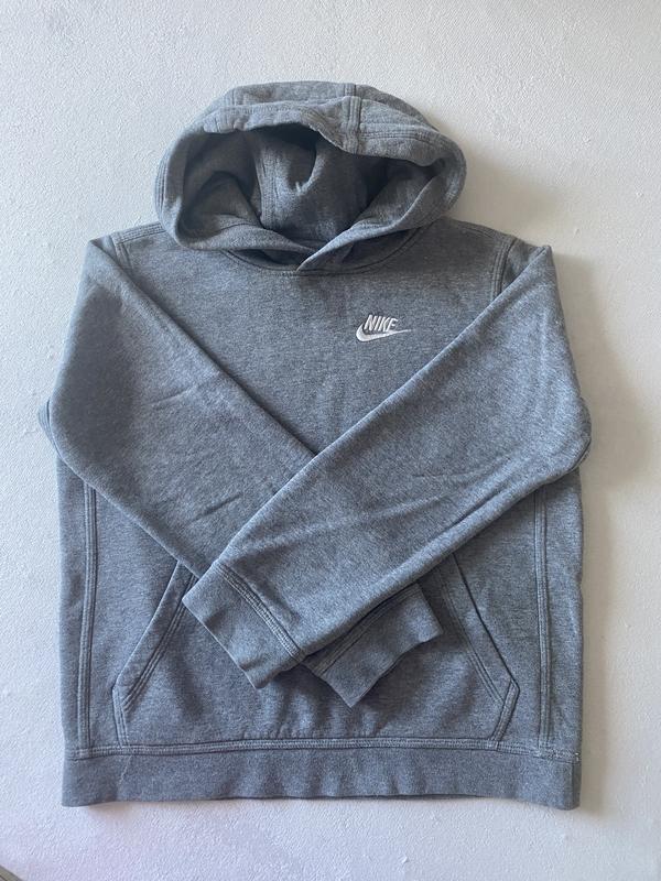 Сіра худі Nike (оригінал). Стильна та зручна худі від Nike з капюшоном і кишенею-кенгуру. Класичний сірий колір, м’який приємний до тіла матеріал. Ідеально підходить для спорту, прогулянок чи щоденного носіння. Стан чудовий — без плям, затяжок чи пошкоджень. Матеріал: бавовна з додаванням поліестеру (80% і 20%). Рекомендовано на зріст 137-147 см. Заміри: • Півобхват грудей — 49 см • Довжина виробу — 49 см • Довжина рукава від плеча — 50 см • Ширина по плечах — 39 см Швидко відправлю будь-якою поштою.