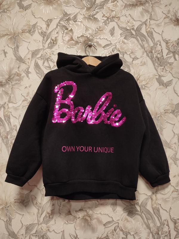 Стильная кофта худи Zara Barbie на девочку 4-5 лет. кофта с двухсторонними пайетками. Высота 43 см, ширина 43 см, рукав от капюшона 45 см. Состояние новой вещи. Качество супер. производство Турция