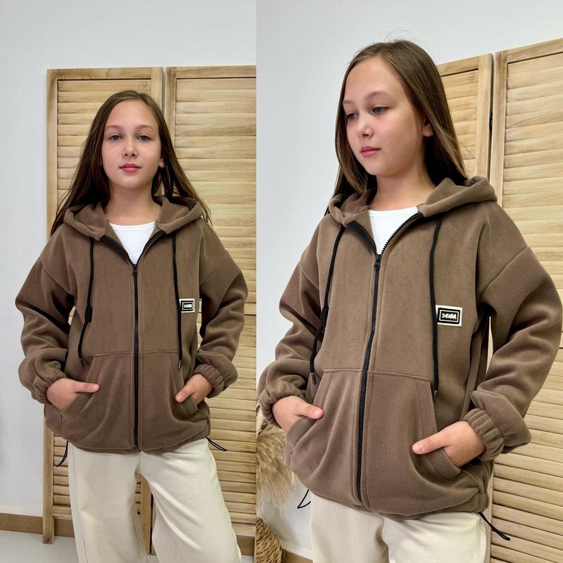 Худи-зепка на молнии с карманами и капюшоном внизу есть утяжка Ткань-флис-полар, тактильно очень мягенький и теплый Супер качество! рост/длин.худи/пог/рукав от горловины похибка+-2см 140/55/48/56-1шт 146/56/49/57-1шт 152/57/52/59-1шт 158/59/54/62-1шт ЦИНА 1040
