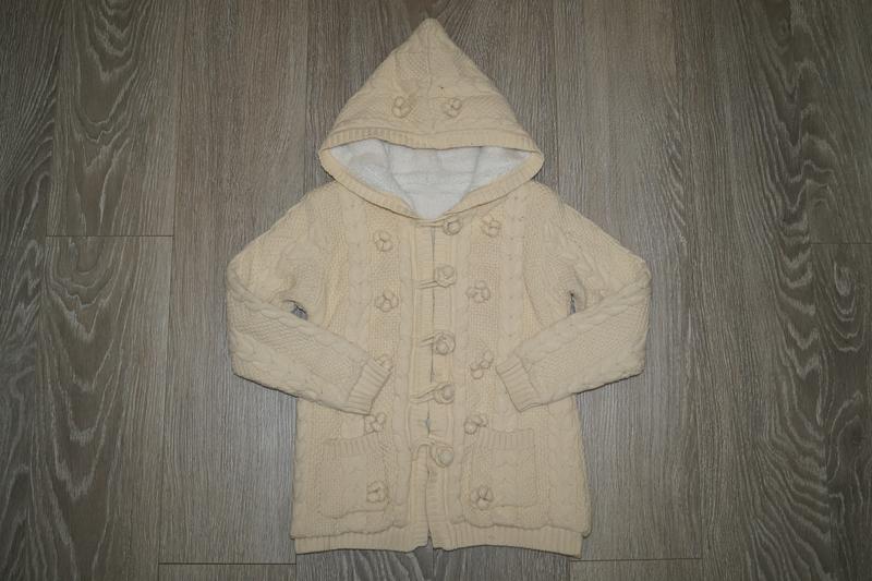 Красивый кардиган с капюшоном для девочки бежевого цвета. Застегивается на пуговицы, 2 кармана. Замеры: Длина 47 см Полуобхват груди 36 см Длина рукава 42 см Стан очень хорош, покупали новым, носил только наш ребенок. На одном рукаве есть маленькая затяжка (акуратно зашита в ателье, визуально совсем не заметно, видна на последнем фото).
