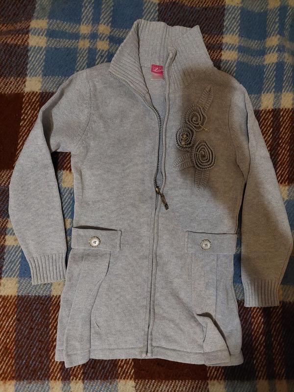 кофтинка-кардиган сірого кольору на замочку, на 10-11років, під рукою трішки розійшлось(показала на останньому фото).а так стан ідеальний дов-63см, п.г.-38см, рукав-46см.