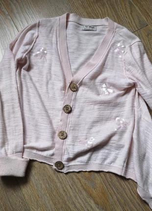 Легкий, нежный кардиган для девочки, весна/лето. Удлиненные края по бокам. Красивые аппликации пайетками - бабки. 100% бавовна Длина 36см Рукав 44см На левом рукаве есть пятнышка, см. фото, в цене учтены.