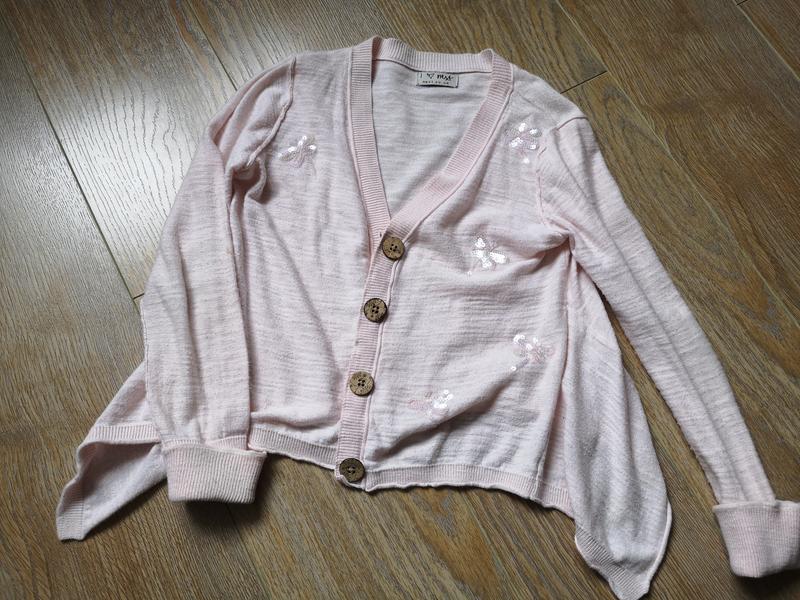 Легкий, ніжний кардиган для дівчинки, весна /літо. Подовжені края по бокам. Красиві аплікації пайєтками - бабки. 100% бавовна Довжина 36см Рукав 44см На лівому рукаві є плямка, див. фото, в ціні враховано.
