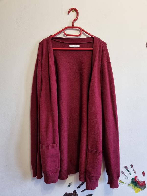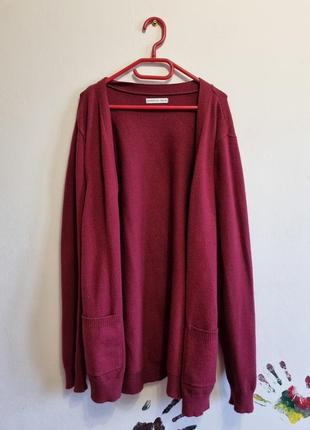 кардиган бордовый, для детей 164 см размер или S для взрослого, дефектов нет, состав: 57% вискоза, 21% коттон, 27% полиамид теплый, тянется пог - 43см пот - 43см рукав от плеча - 61см длина от плеча - 67см