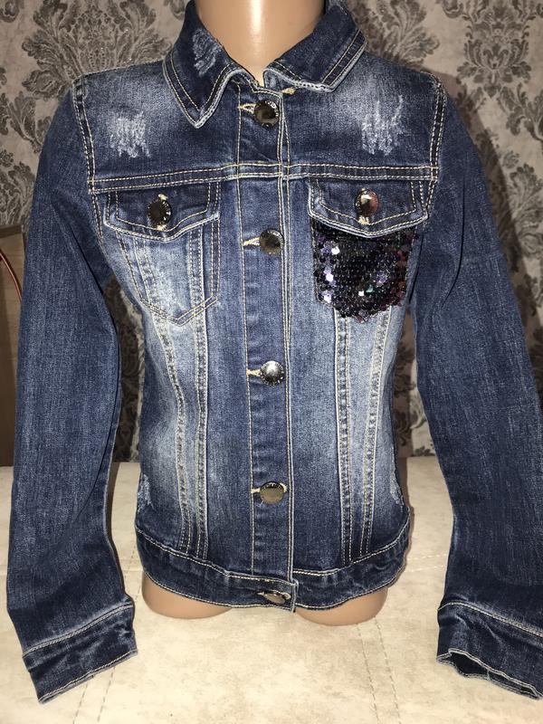 Джинсовая куртка, состояние хорошее, размер 134-140. Замеры скина по необходимости, карман с пайетками.