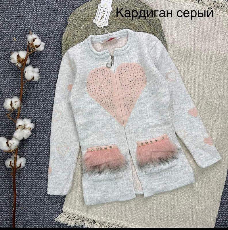 Вязаный кардиган про-ва Турция! Застегивается на молнию. Карманы-хотные. Акрил 100%. Серце прикрашене стразами. Размеры: 12-13 – рукав 50, длина 62 13-14 – 55/68 Цена: 515 грн КрохпельКа