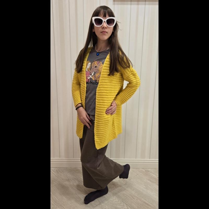 солнечный кардиган для девчонки на рост 140 замеры длина 71см, длина рукава от горловины 56см окр.гр. 52см