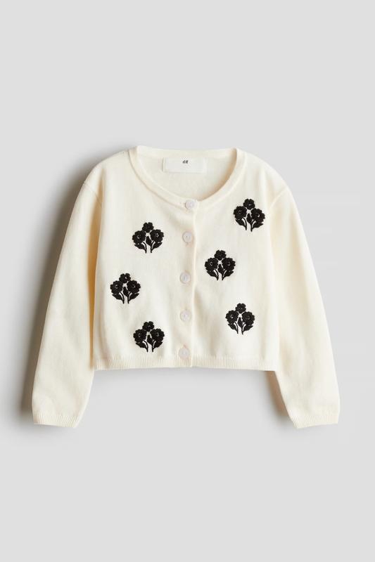 Ніжний кардиган з м'якої бавовни тонкої в'язки з круглим вирізом горловини, гудзиками спереду. Вузька обробка навколо горловини, манжетів і подолу. Розмір 4-6 р