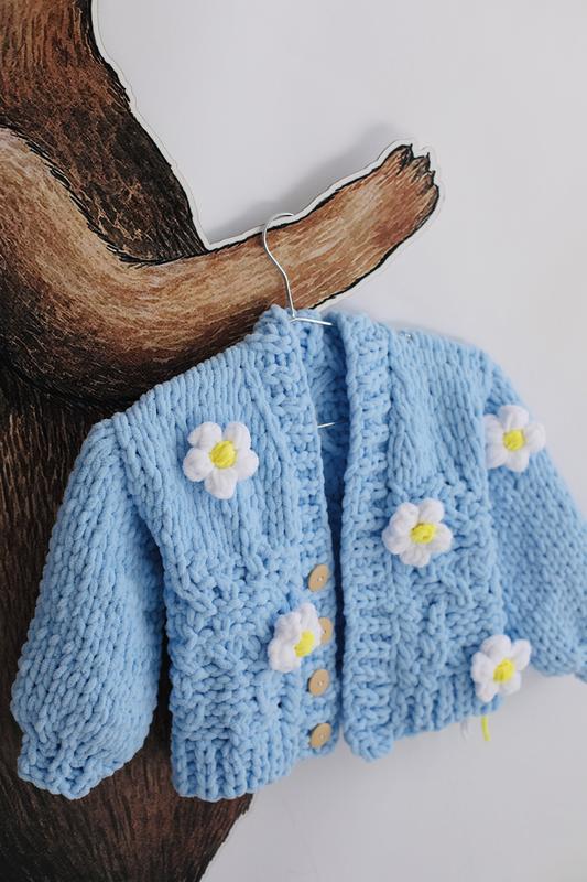 Плюшевый кардиган ручной работы с снимаемыми ромашками. Очень мягкий и теплый. Размер 110, могу сплести другой размер и цвет