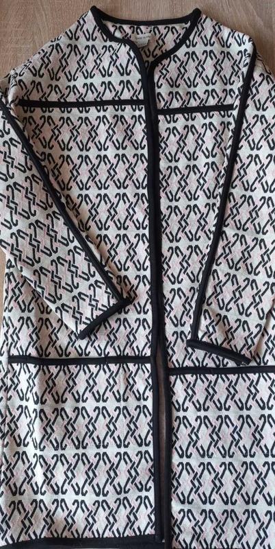 пог 42, по спине 42, длина 76, не застегивается, есть карманы. Белый с черными и розовыми полоски
