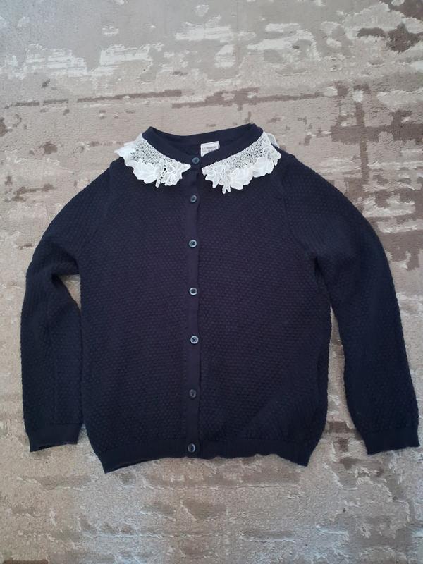 Кардиган для девочки 6-7 лет, темно-синего кольра. Идеальный вариант для школы. Длина 43 см, грудь 35 см, рукав 41 см.