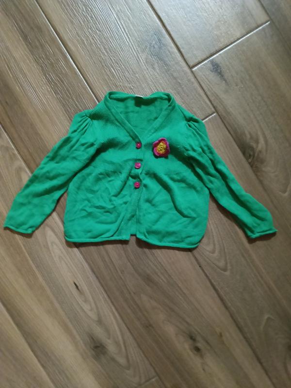 Дитячий кардиган.Матеріал трикотаж.Застібка на ґудзики.Декорований в'язаною квіточкою спереду.Легкий та зручний.Підвйде для щоденного носіння.Зріст 80см.Вік 12 місяців.