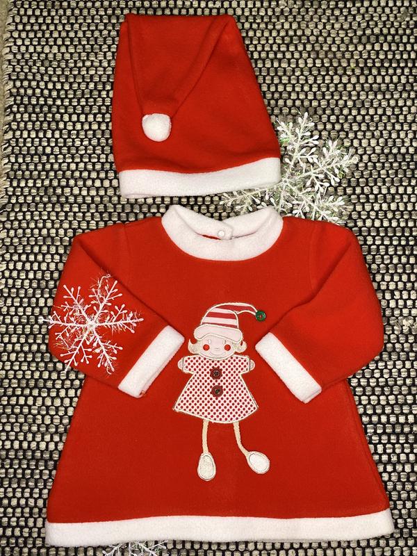 Новорічний костюм для дівчинки р. 62 (3 міс) In Intenso. Мʼякусінький теплюсінький костюмчик для манюні. Сукня ззаду на кнопках. Стан ідеал. В цьому костюмчику ваша красуня подарує вам новорічні незабутні емоції та враження. Сукня оздоблена наліпкою/вишивкою з ніжками, якими малеча буде гратися. Заміри (все напівобхват): шапочка 16-17 см Сукня: 33 довжина, 25 груди, довжина рукава 22 см