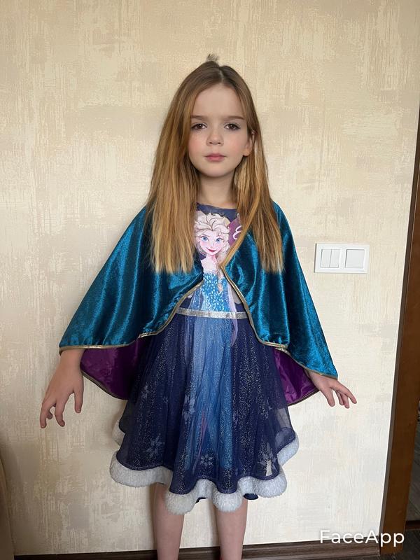 Ж20. По наборке костюма 6 7 лет. Однако на фото одет на ребенка который 9. То есть стоит Ориентироваться на замеры. Длина платья 72 от плеча до талии 30 полу окон груди 36 на пол обхват талии 33. Состояние очень хорошее. Без нюансов. Накидка крепится на липучки.