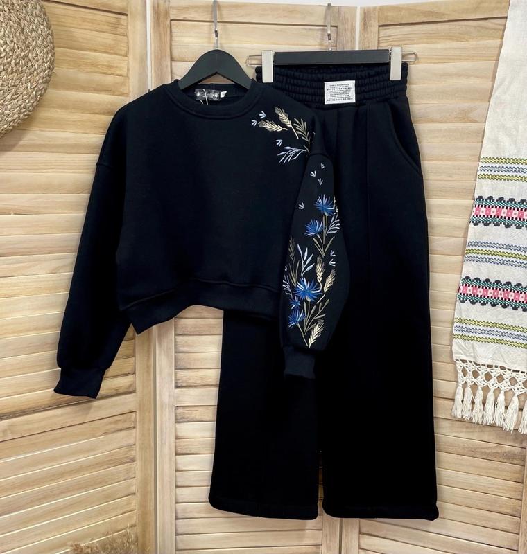 отправка36 года Суперский костюм свитшот с настоящей вышивкой манжеты измельченная штаны палаццо-трубы с карманами в поясе под резинку по переду висточка Ткань трехнить пенье на флисе (не подвержена появлению катышков) Цвет черный СУПЕР КАЧЕСТВО! цена 1180 грн рост/длин.свитшота/пог/рукав от горловины/длин.штанов/крок/пот/поб похибка +-2см 140-146/44/52/60/90/64/27/46 146-152/45/53/61/94/66/28/47 152-158/49/55/65/99/70/29/48 158-164/53/56/67101/72/30/49 164-170/57/59/72/104/76/31/50 арт77