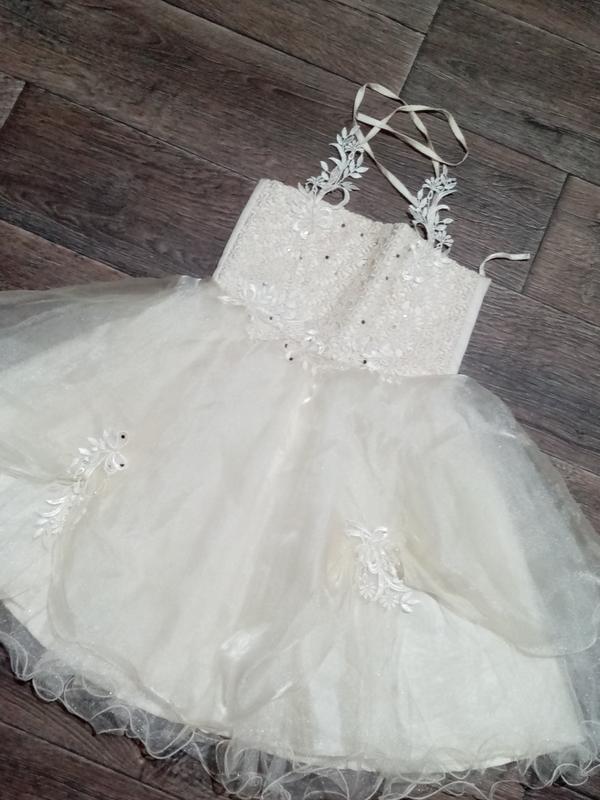 Детское новогоднее платье нежно кремового цвета. На возраст от 3 до 7 лет. На спинке есть утяжка, которая фиксируется по фигуре ребенка. Платье в хорошем состоянии. Есть небольшой недостаток. Его совсем не заметно.Отрабатывают после оплаты на карточку.Повтребления нет.