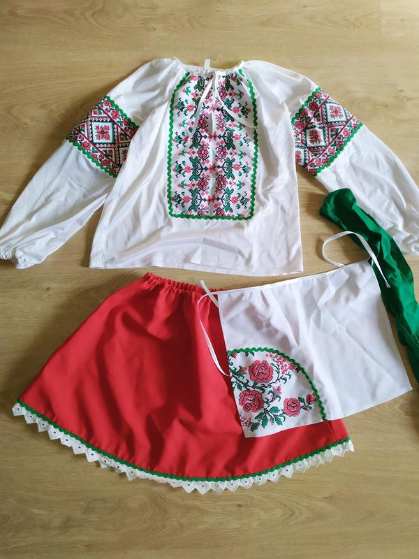 Юбка длина 36 см и рубашка покроя реглан: полуобхват груди 41 см, длина переда 45 см и длина рукава 57 см. Вышивка нарисована. Костюм Б/У (есть брак). Незначительные пятна на рубашке и юбке (три последних фото), нейлон рубашки немного затерт.
