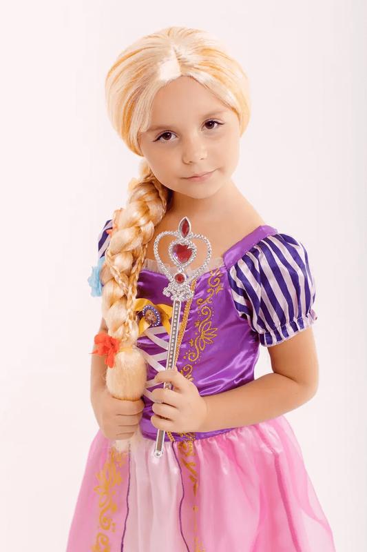 Платье Рапунцель для девочки 3-8 лет 0296 Карнавальный костюм одной из самых любимых и узнаваемых диснеевских принцесс – Рапунцель. Эта очаровательная длинноволосая красавица покорила сердца миллионов девочек во всем мире, которые желают хоть на миг перевоплотиться в любимую героиню. Облик этой доброй, милой принцессы с храбрым, любящим сердцем подойдет и застенчивой девочке, и юной разбойнице, ведь в истории Рапунцель место было разным приключениям. Мы предлагаем карнавальное атласное платье, что в точности повторяет наряд героини. Особенности и преимущества костюма: - платье пошито из атласа, имеет интересный перелив на свету; - короткие рукава-фонарики имеют полоски, как у героини мультфильма; - на груди платя есть шнуровка лентами, бант, брошь с изображением принцессы; - юбка многослойная, пошита из атласа, органзы, полиэстера. - застежка в виде потайной молнии идет с боку платья. Размер: - 110 (3т) длина 65 см, обхват груди 56 см, идет на рост 95-105 см - 120 (4т) длина 68 см, обхват груди 58 см, идет на рост 100-110 см - 130 (5т) длина 72 см, обхват груди 60 см, идет на рост 110-120 см - 140 (6т) длина 77 см, обхват груди 62 см, идет на рост 120-130 см - 150 (8т) длина 80 см, обхват груди 64 см, идет на рост 130-140 см Указывайте необходимый размер в комментарии к заказу.