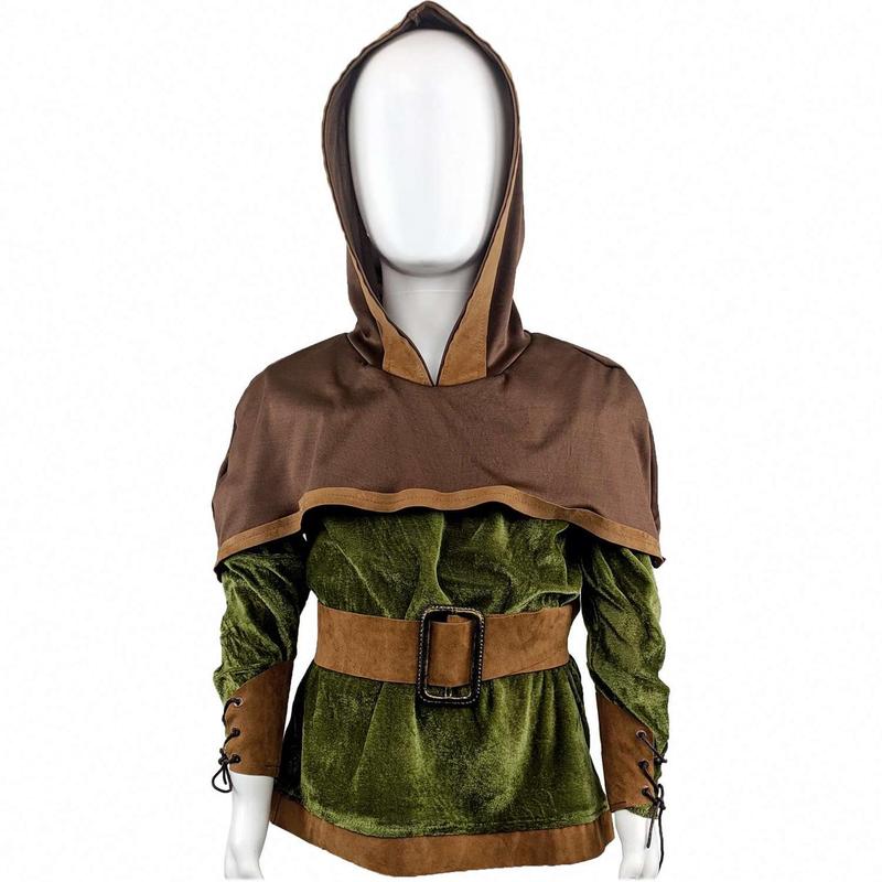 Камзол Робин Гуд 21-530 Материал: синтетическая ткань, металл Описание: Размер - 31-32 Рост - 116-122. Возраст - 6-7 лет. Длина - 49 см. Полуобхват груди - 38 см. Длина рукава - 43 см. Детская кофточка для сценического образа: охотник, Робин Гуд, лучник, гном, эльф.