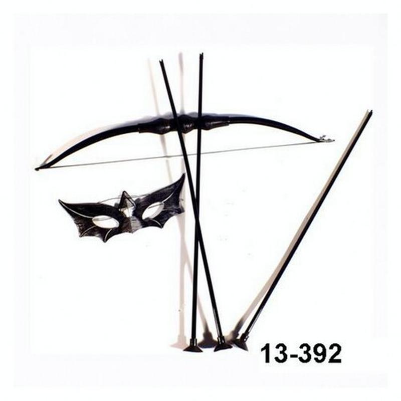 Лук - 46 х 8,5 см, стрела - 44 см, маска - 18 х 8 см. В наборе - лук, 3 стрелы с присосками, маска на резинке. Подойдет для образа Ниндзи.