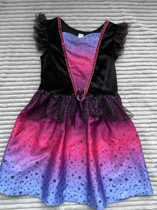 Платье красивое, яркое с переливами. Украшена паучком, рюшами и блестками. Может быть как костюм ночи или ночного неба. Может подойти на Хеловин. Тканина верху трикотаж, тягнеться в ширину. Размер указан 122-128см Длина 70см Ширина в поясе 31см (тянется) Стан идеален, наденьте один раз.