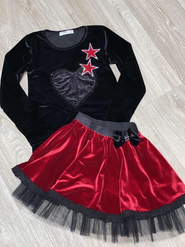 Шикарный комплект, мягкая ткань. На любой праздник Велюр мягкий и приятный Юбка с фитиновым подкладом, в поясе резинка. Реглан украшен звездочками и сердечком В наличии 128-140-152 ( подойдет на 116-150р)