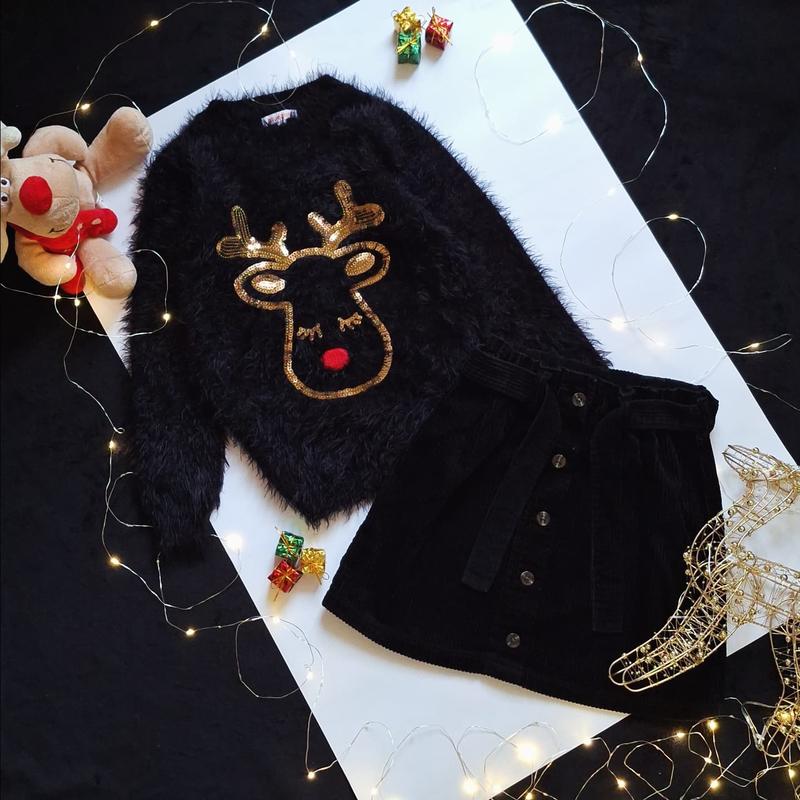 Свитер черный травка, Олень-паетки вышиты ✔️ Bluezoo ✔️ 7-8р ✔️ Нового ✔️ дов-48,шир-36,руки-48 ✔️ Юбка черная вельвет, умает пояс ✔️ Next ✔️ 8р ✔️ Нового ✔️ дов-35,пояс-26 резинка ґудзики