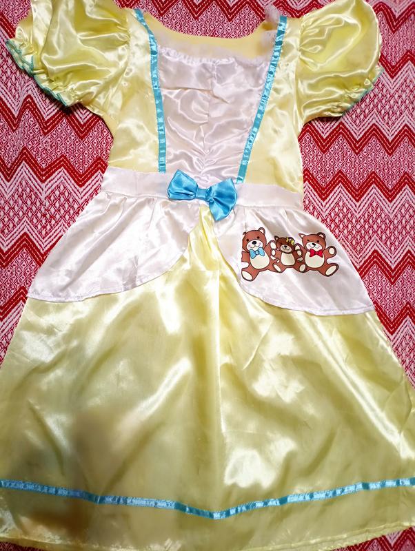 карнавальное платье, Маша и три медведя. есть небольшие дефекты указанные на последних двух фото, но в носке не очень заметные., ткань атлас. длина по спинке 70 см, полуобхват талии 28 см, на резинке. полуобхват груди 29 см. ткань на спине тянется.