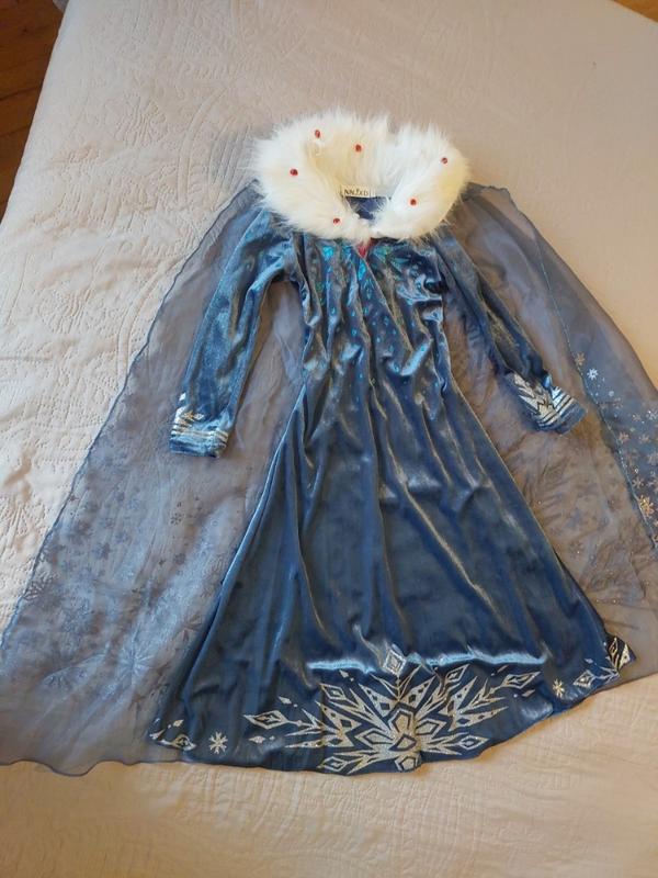 Платье Эльзы в размере 120 из велюра, длинный рукав, отложной воротничок из искусственного меха, длинный шлейф по длине платья. Хорошее качество. Китай.