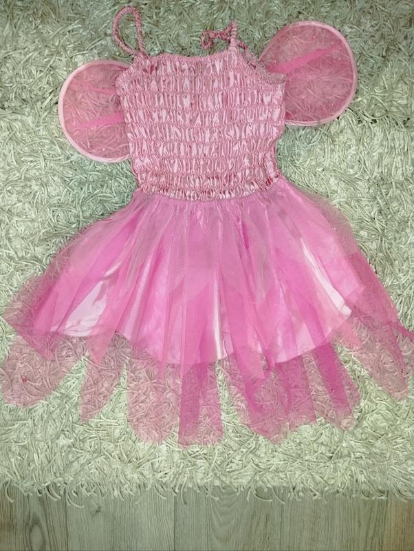 Платье Феи,верх на резинке ,юбка атлас а сверху жёсткая сетка.Есть дефект,один лепесток сетки разорван,один оторван,есть дырочка от бусины.Увиднла, когда утюжила. Палочка в комплекте. Все замеры на последнем фото