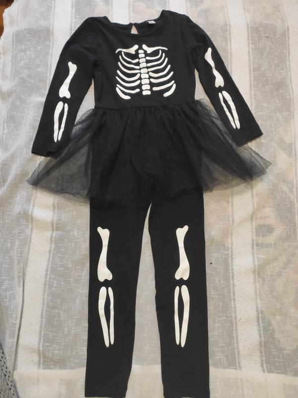 карнавальный костюм скелет, кост на 7-9роков TU 95% коттон 5% нласта Замеры: длина - 101см, ширина под руками - 35см, талия резинка 27см длина рукава - 44см шаговый шов 50см Цена 280грн Смотрите другие Мои объявления