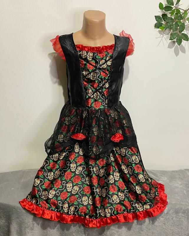 Карнавальное платье на Хэллоуин для девочки 9-10 лет Ширина (по груди) - 37см Ширина (по талии ) - 35см Ширина (по бедрам) - свободное, хорошо расклешено Длина 77см Состояние нормальное, небольшие нюансы