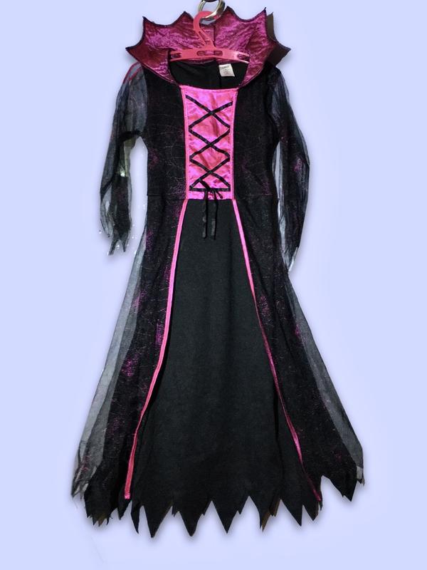 Платье на девочку 7-8 лет. Образ ведьмы, королевы или феи , платье черное с имитацией корсета ярко розового цвета и сетчатой накидки с блестящими розовыми паутинками. Идеальный наряд на Хеллоуин и другие карнавалы. Материал эластичный, Хорошо тянется в ширину.Замеры : Длина - 90 см , ПО груди 36-41 см, ПО талии 28-34 см.