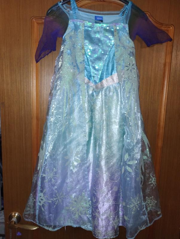 Платье Эльзы размер 110/116. Платье в целом состояние хорошее, но на рукавах есть затяжки и сзади юбка в затяжках от блесток, но это незаметно в жизни под плащем.