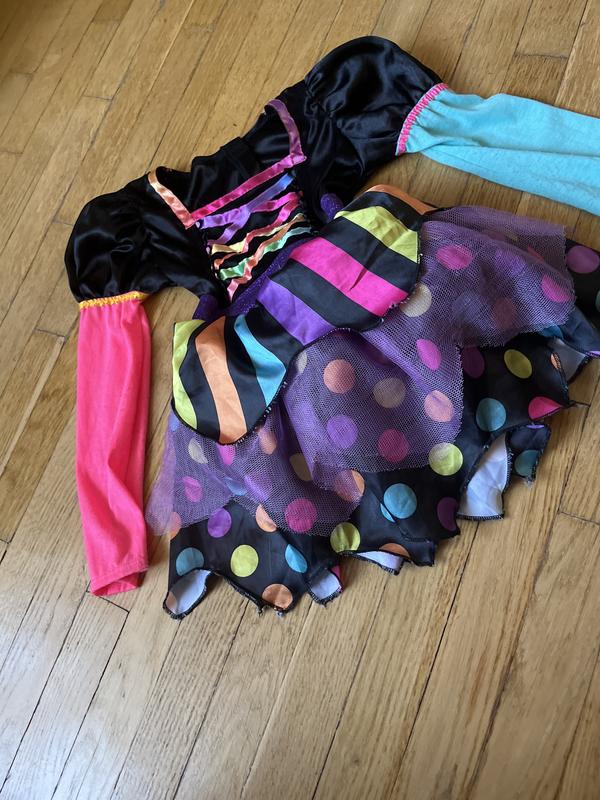 Тип: Карнавальна сукня або костюм відьми. Стиль: Костюм має різнокольоровий дизайн із візерунками в смужку та горошок. Особливості: Ліф чорного кольору зі шнурівкою райдужних кольорів. Рукави різного кольору (рожевий та бірюзовий/блакитний). Багатоярусна спідниця з кольоровими смужками, блискучим поясом, тюлем та різнокольоровими великими горошками на чорному фоні. Призначення: Ідеально підходить для святкування Хелловін або інших костюмованих вечірок.