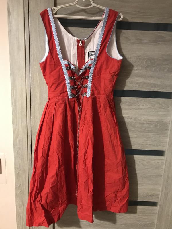 Карнавальне червоне плаття з імітацією корсету 36 р .Замір виробу довжина 98 см . Півобхват грудей 44 см.