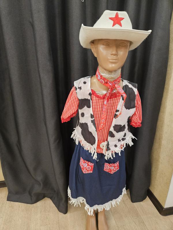Девочка ковбой, платье, шляпа,жилетка снимается, не вшитая,пояс на шею шарфик,новый,капелюх немного не свежий,размер м,манекен 122 рост, крупновато,десь8-.9-10